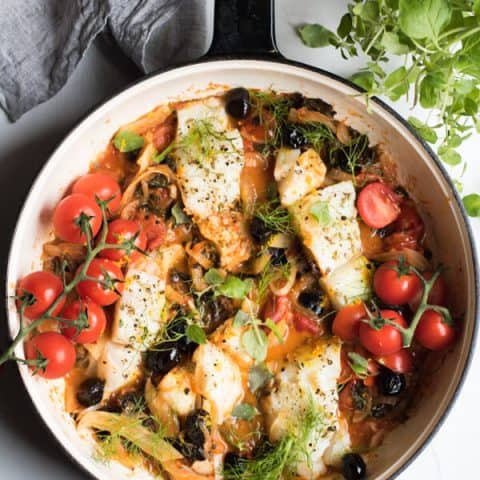 Easy Mediterranean cod with fennel, kale and black olives, a healthy complete meal prepared in one pan and ready in 30 minutes!