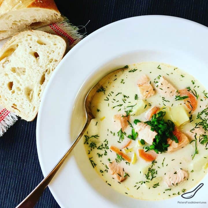 Finnish Salmon Soup (Финская уха) or Lohikeitto, is delicious and creamy Salmon soup, popular across Scandinavia and Northwestern Russia. Usually made Salmon heads and bones for the broth, this soup is delicious and full of vitamins and minerals.