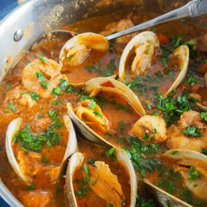 Fancy Bouillabaisse is full of shrimp, lobster, crab in a light flavorful healthy broth perfect for a great meal to serve company! A fish stew ready in less than 45 minutes!