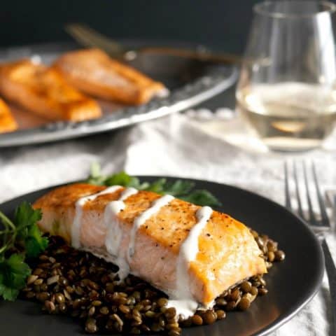 Meaty broiled salmon fillets on a bed of savory lentils topped with yogurt cumin dressing. A ridiculously easy, healthy, gluten free and, oh yeah, delicious dinner.