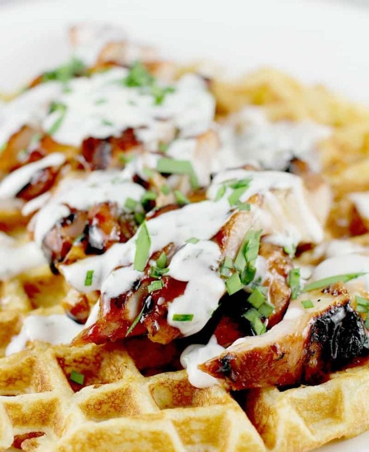 Juicy, tender, beer-marinated barbecue chicken served in a fluffy soft waffle topped with an herbed buttermilk ranch dressing and a generous drizzle of honey. Rethink traditional chicken and waffles, and go to the grill with my Honey Beer BBQ Chicken and Waffles.