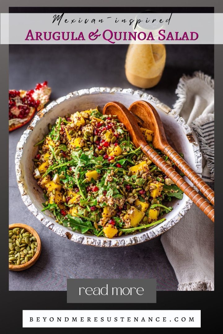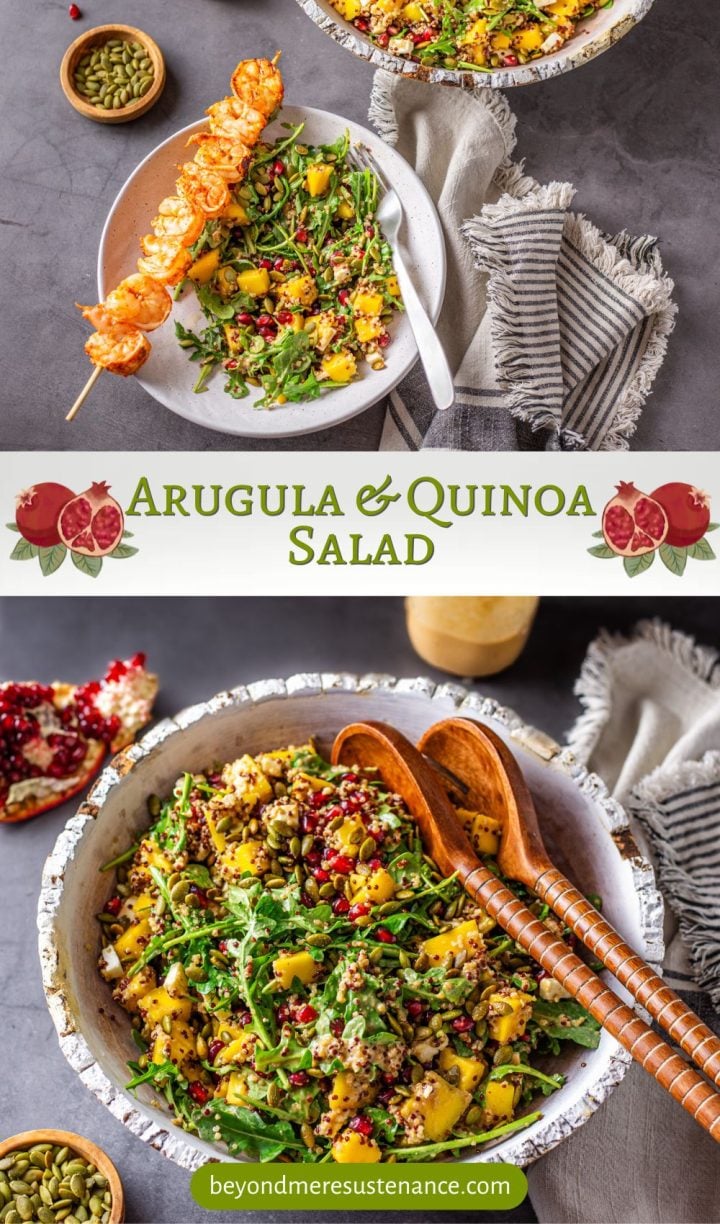 A healthy, Mexican-inspired salad, this Arugula and Quinoa Salad features luscious mangoes, toasted pepitas, queso fresco, pomegranate arils, and a tangy pomegranate vinaigrette. The quinoa takes about 10 minutes, and you can prep the salad and make the dressing in that time frame. Muy rico!