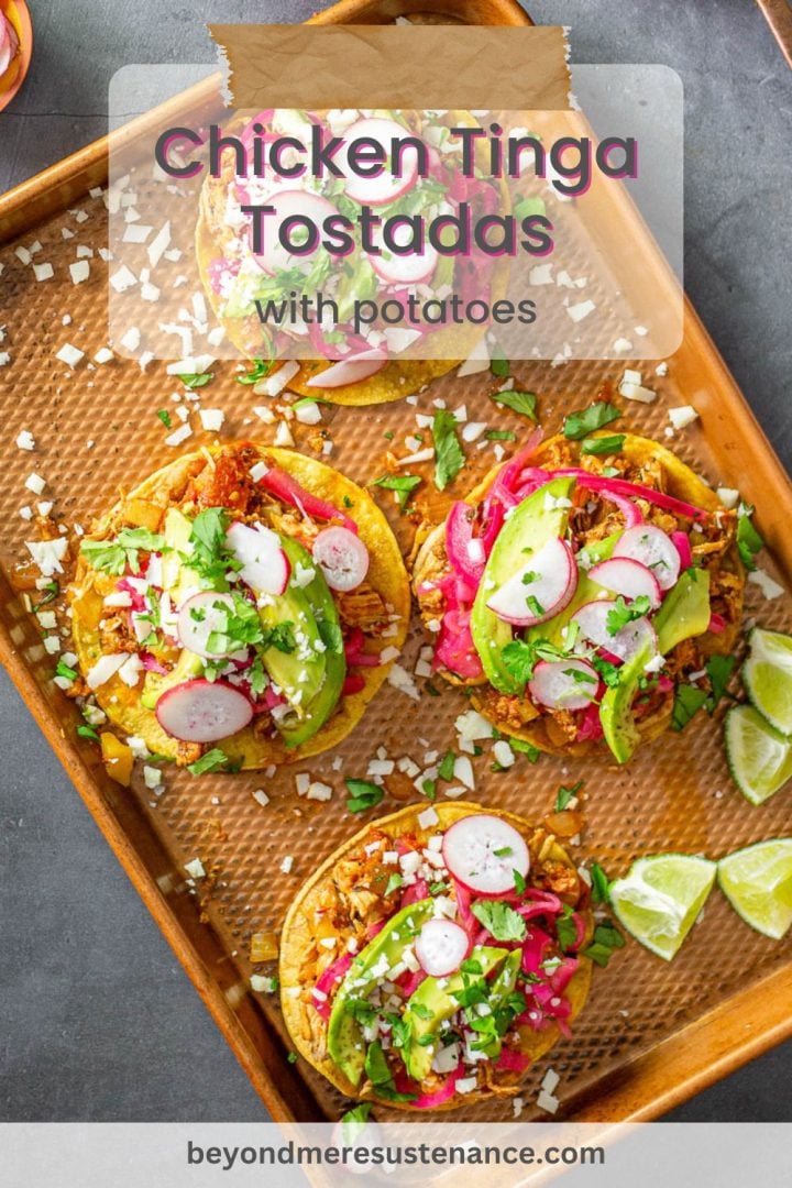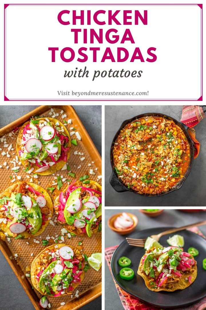 Chicken Tinga Tostadas with Potatoes features a traditional chicken tinga (tinga de pollo) on baked corn tortillas. I’ve provided several topping suggestions, but we love it (and keep it simple😊) with quick pickled onions, sliced avocado, and crumbled cotija cheese. The tinga takes about an hour to make, but it’s great for meal prep if you make a big batch!