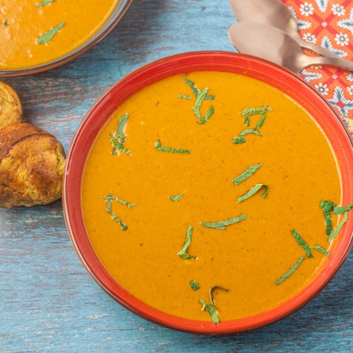 This creamy, savory pumpkin soup is so versatile! Make it "fancy" and serve it in mini pumpkin bowls, or keep it simple and serve it in a bowl. It's gluten free, vegetarian, and is easily made dairy free and vegan...