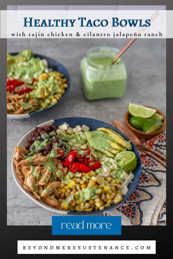 In the process of working on this healthy taco bowl, I did some research to see what was available on the internet. I was a little surprised to see a LOT of ground beef, shredded lettuce, grated cheddar, chopped tomatoes, a scoop of guacamole, and a generic looking salad dressing. Never one to stick to the predictable, I wanted to do a taco bowl that would still be quick and easy, but one that was flexible and included more interesting components.