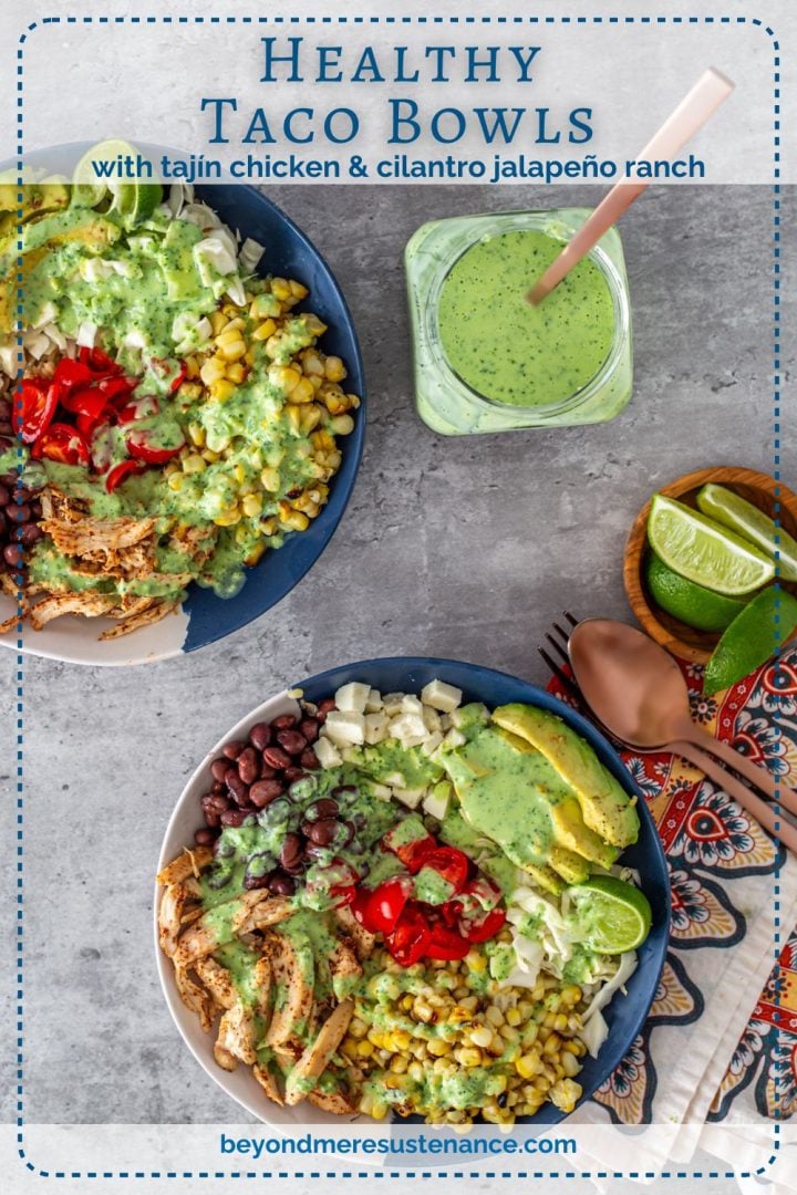 Think of these Healthy Taco Bowls as deconstructed tacos served in bowls, featuring upgraded healthy taco ingredients but without the tortilla. This is not your standard taco salad turned taco bowl. With a base of cumin and garlic rice, black beans, rotisserie chicken tossed with tajín, corn (grilled or not), tomatoes, queso fresco, and shredded cabbage, it’s easy but sure to suit your sophisticated palate. Top your bowl with your favorite salad dressing (like this cilantro ranch!), and some sliced avocado and lime wedges. Provecho!