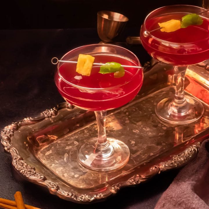 With a subtle hint of spice and fruit, and its gorgeous red-violet hue, this unique Chicha Morada and Pisco Cocktail is sure to delight at your next cocktail party!