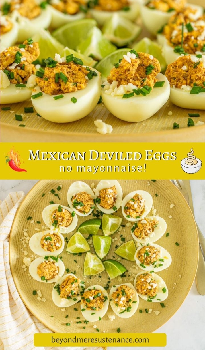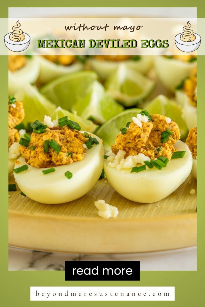 - Garnish the deviled eggs – As shown in the photos, I garnish with more crumbled or grated cotija and fresh chives. Cilantro is another good option. Lime wedges are a nice addition.