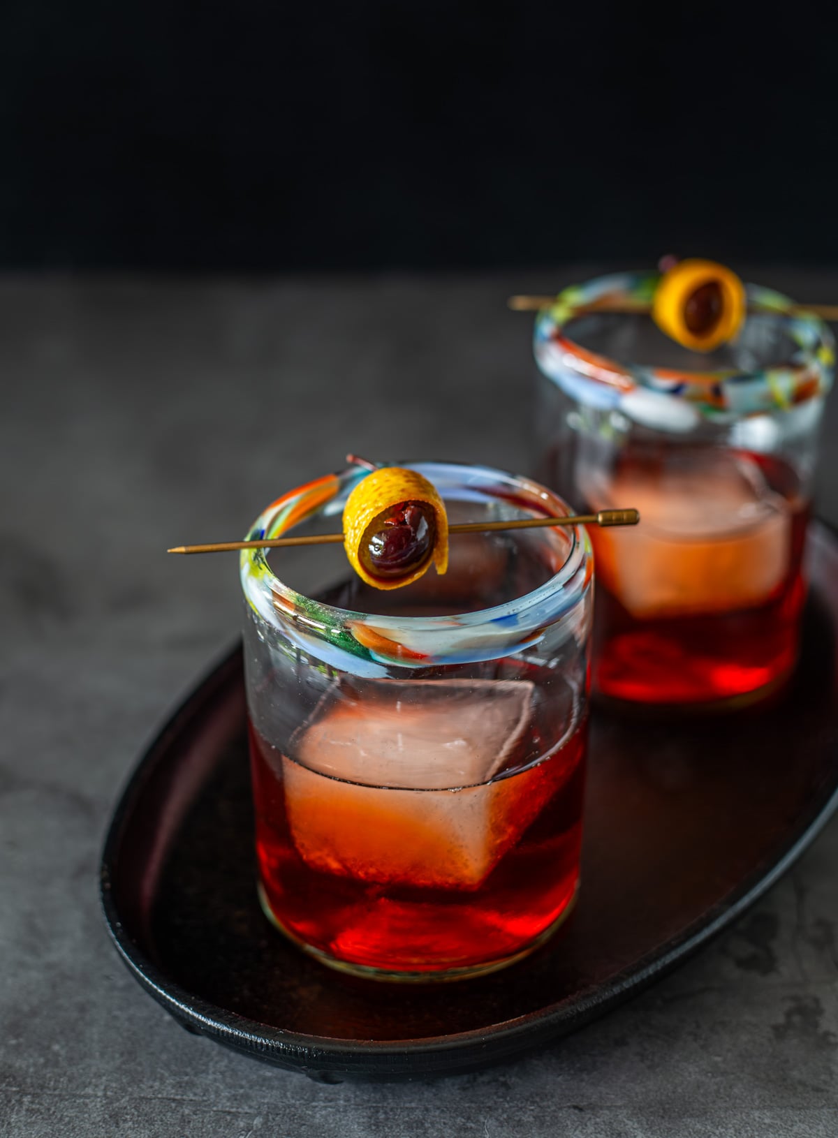 - garnish – A beautiful cocktail requires a garnish IMHO. I used a potato peeler to remove the orange peel, a paring knife to create a rectangle, and wrapped a fresh cherry with the orange peel before spearing with a cocktail pick!