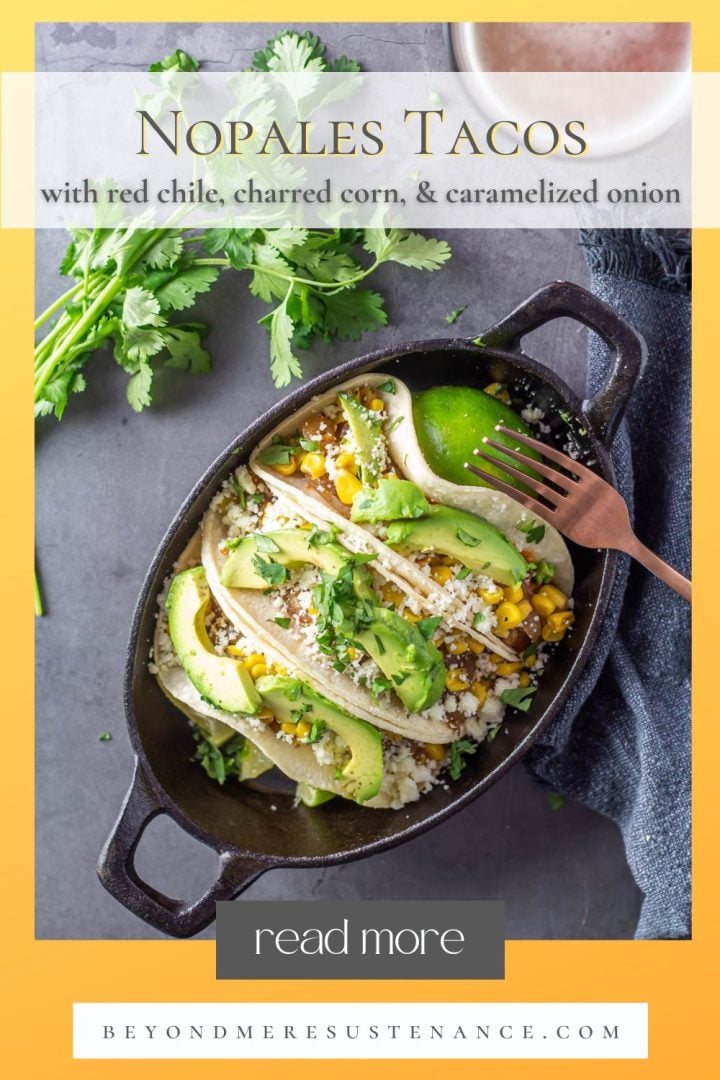 I usually use just my cast iron skillet – 1 pan to wash! I start with the caramelized onions, then the charred corn, and then the nopalitos and red chile sauce. If you’re pressed for time, you can use more than one pan (but then there’s more to clean up!).