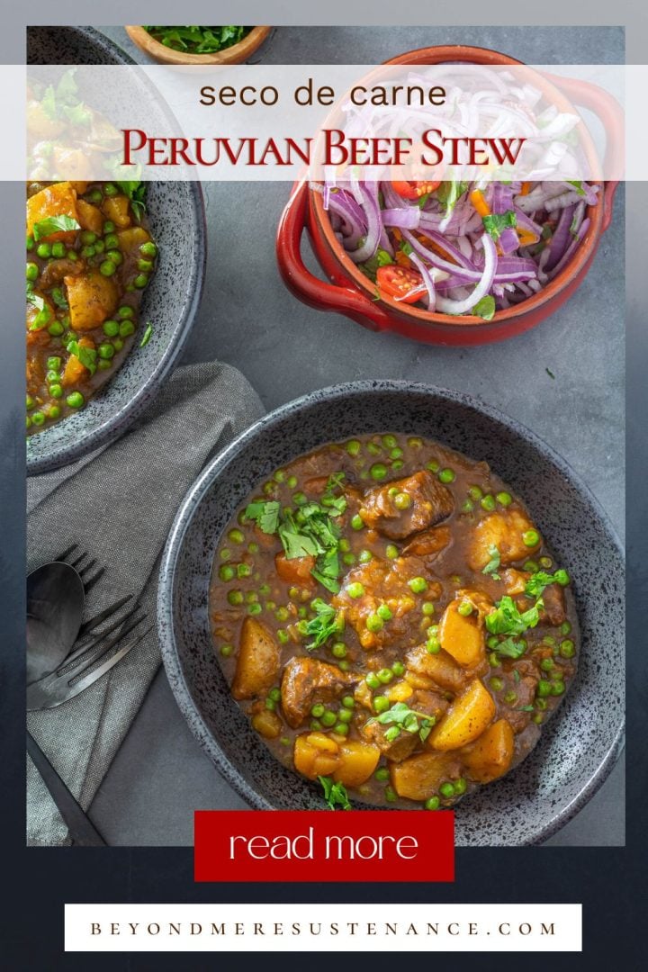 Originally, goat (cabrito), lamb (cordero), and deer (ciervo) were typical, but in modern times, beef is the popular choice. We don’t indulge in beef often, and when we do, it needs to be tasty! This dish is so tasty. I like to serve seco de carne with salsa criolla, but Peruvians are likely to have it with rice and beans. I think plantains, yuca, and ají verde would be nice sides as well.