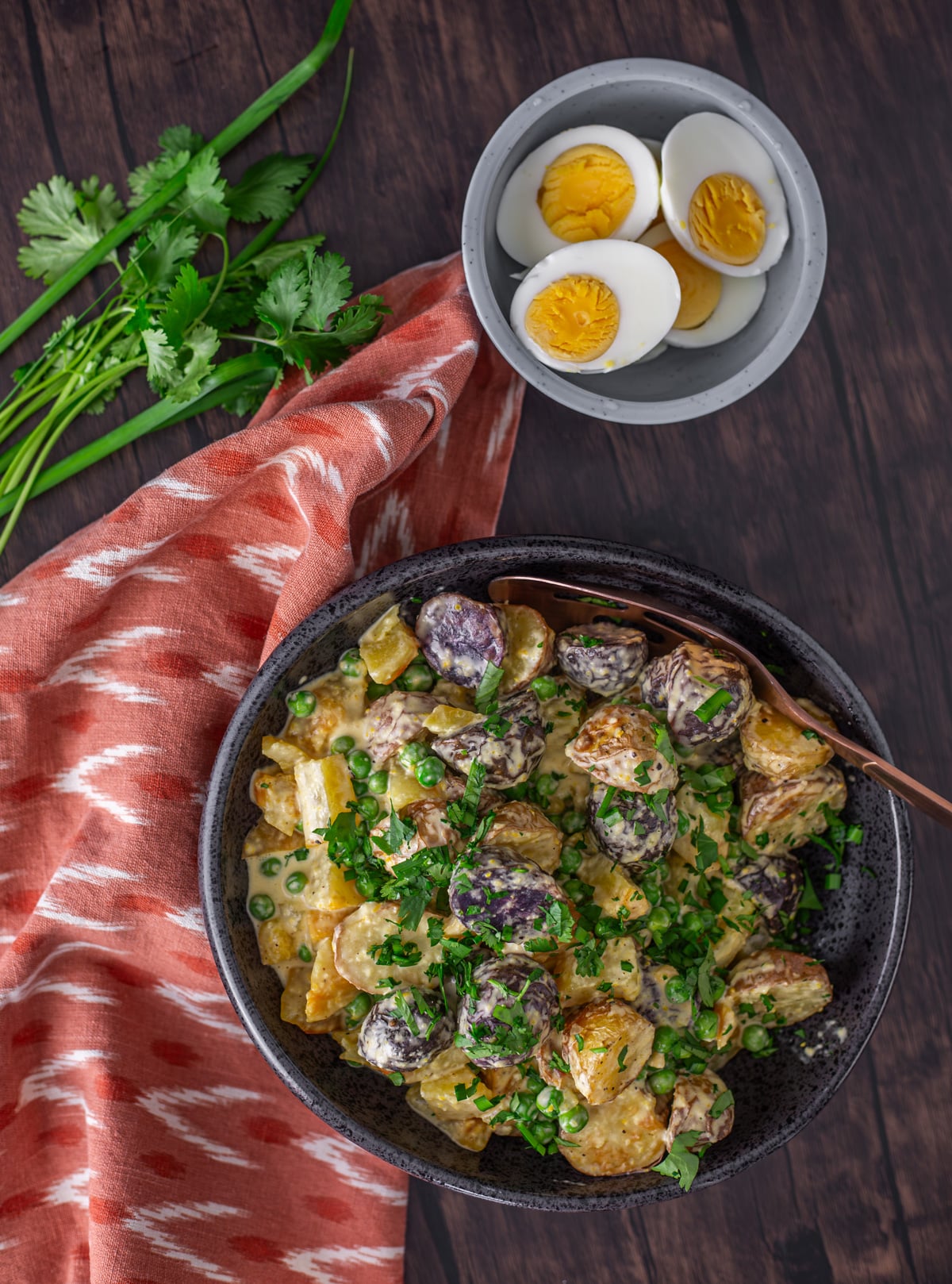 - peas – I can get fresh peas for a couple of weeks each year. In Peru, they’re widely available. Frozen peas are great, so no worries. I just thaw them in cold water, and add them when I mix everything together. If you’re fortunate enough to have fresh peas, you’ll want to cook them until they’re tender before adding to your potato salad.