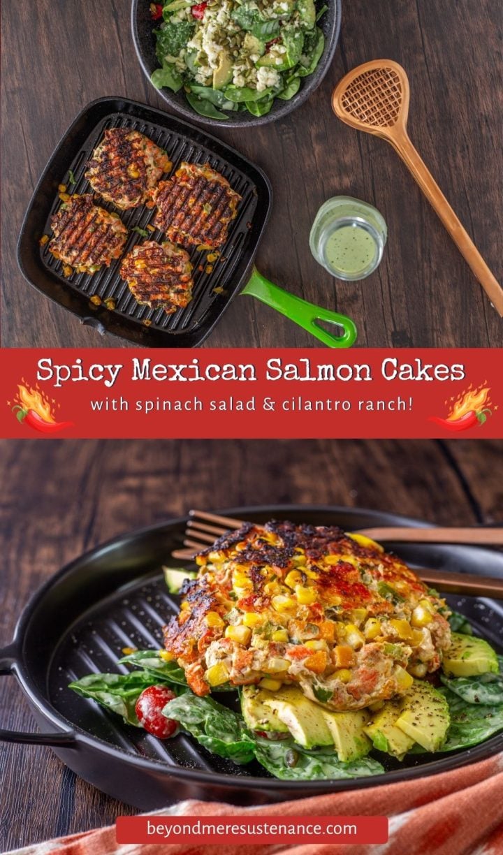 These Spicy Mexican Salmon Patties with Creamy Cilantro-Jalapeño Ranch and Spinach Salad became a “thing” after I regularly relied on an ultra-quick meal of HEB house made salmon patties (Texas grocery chain) atop a simple spinach salad with complementary dressing.